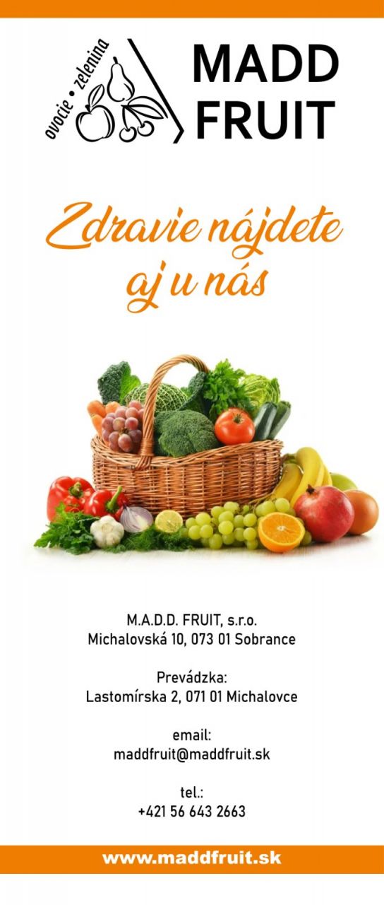 Naším poslaním je šíriť zdravie, sviežosť a vitamíny. Našou prioritou je profesionalita, dochvíľnosť, dynamickosť, kvalita, profesionálny prístup a spokojní zákazníci. Produkty, ktoré máme skladom sú svieže, voňavé so skvelou chuťou. Sme tím mladých, dynamických a spoľahlivých ľudí, pre ktorých je práca poslaním. Ovocie a zelenina z M.A.D.D. FRUIT je pre Vás tá správna voľba.