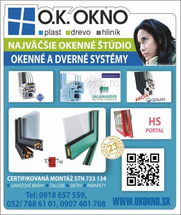 Spoločnosť O.K.OKNO pôsobí v oblasti predaja a montáže plastových okien, dverí a doplnkov na slovenskom trhu od roku 2004.Spolupracujeme s viacerými lídrami svetového okenného priemyslu. V ponuke máme veľký výber profilov, môžete si vybrať predovšetkým zo značiek Gealan, Salamander, Veka so stavebnou hĺbkou od 70mm o 83 mm vo veľmi širokej škále farebných prevedení s možnosťou použitia rôznych izolačných skiel. Uvedené profily sú zárukou kvality a dobrej ceny. Realizujeme komplexnú dodávku a montáž plastových okien, dverí, garážových brán, parapetných dosiek a rôznorodej interiérovej a exteriérovej tieniacej techniky. Komplex našich služieb pozostáva z odborného poradenstva, vypracovania cenovej ponuky, bezplatného zamerania, okrem odbornej montáže sa venujeme aj drobným stavebným úpravám a tento komplex služieb dopĺňa záručný a pozáručný servis. Odborné poradenstvo a montáž zabezpečujeme vlastnými, skúsenými pravidelne školenými pracovníkmi . Ku každému zákazníkovi pristupujeme individuálne a snažíme sa pružne reagovať s cieľom dosiahnuť optimálne riešenie a splniť aj tie najnáročnejšie požiadavky. U nás nájdete výborný pomer ceny a kvality. Stratégiou firmy O.K.OKNO je spokojnosť zákazníka, splnenie jeho požiadaviek a skrátenie dodacích termínov na minimum